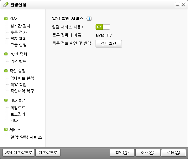 등록 이후에는 환경설정의 "알약 알림 서비스"에서 관리 가능하며, "알림 서비스 사용"이