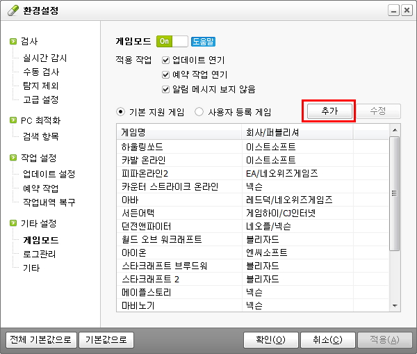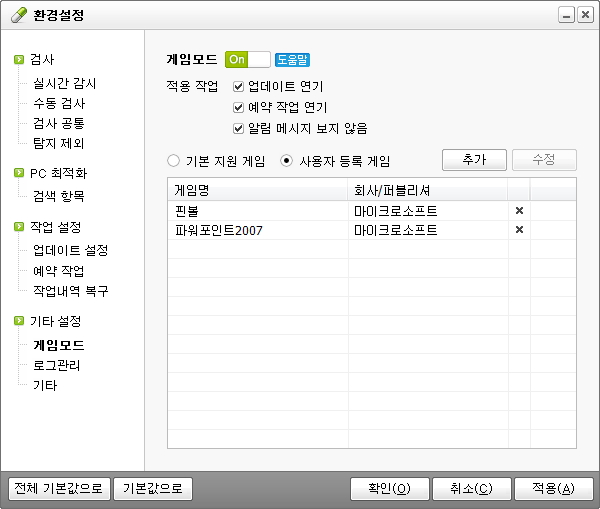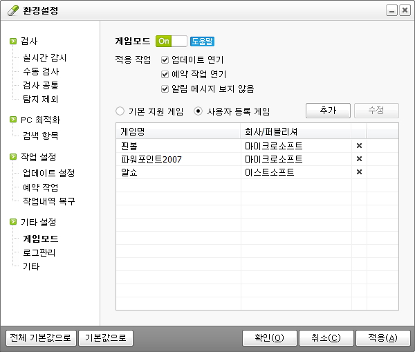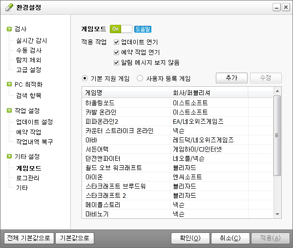 (알약 설치 후 기본적으로 게임모드 기능이