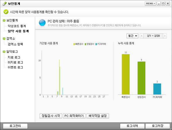 알약과 관련된 악성코드와 기능 사용 통계들을 확인할 수 있으며, 감염된 파일들을 격리하는 검역소와 로그를 확인할 수 있습니다.