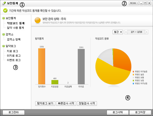 알약에서 탐지된 악성코드의 탐지횟수, 치료성공, 치료실패, 미치료 여부를 확인할 수 있으며 위험도에 다른 분류 그래프를 확인할 수 있습니다.