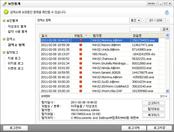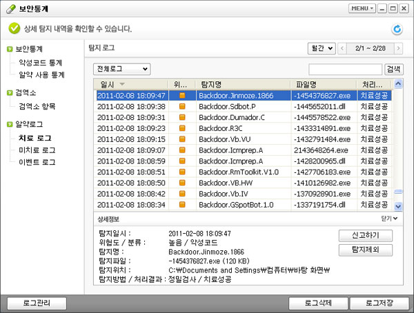 [탐지로그 보기] 버튼을 누르면 치료 로그 항목으로 이동합니다.