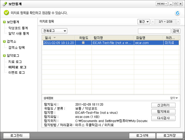 알약 검사에서 탐지된 악성코드를 치료하지 않은 경우 미치료 로그에 기록됩니다.