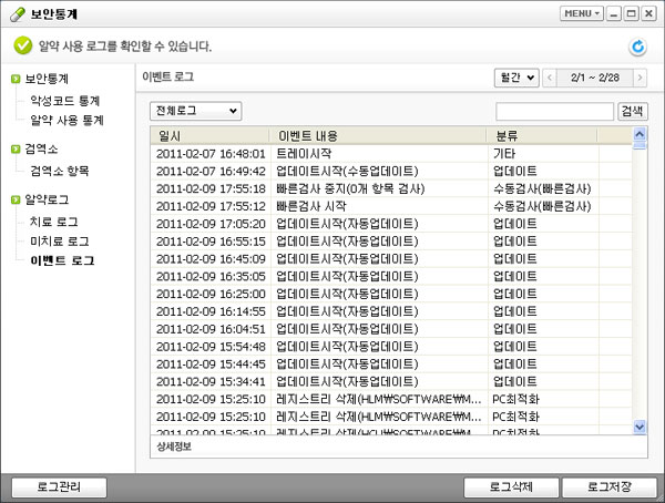 로그의 저장 및 삭제, 로그관리(보관기간) 설정을 변경 할 수 있는 버튼이 있습니다.
