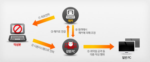 - 악성봇 감염 시, 온라인게임 계정 유출, 특정 홈페이지 공격, 스팸메일 발송 등 해커가 의도 한대로 악용될 수 있으며, 시스템이 느려지는 증상도 발생할 수 있습니다.