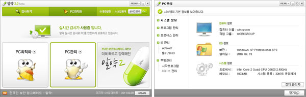 알약의 PC 관리를 통한 시스템 및 인터넷 관련 설정으로 시스템 부팅 및 인터넷 로딩속도를 향상시킬 수 있습니다.