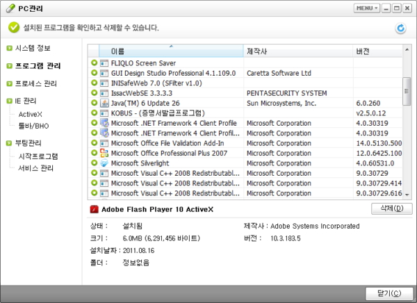 - PC에 설치된 프로그램을 삭제할 수 있습니다. (제어판의 프로그램 추가/제거와 동일)