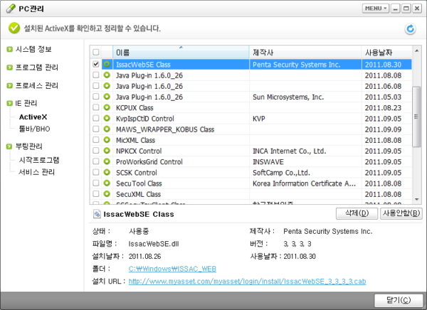 - PC에 설치된 ActiveX 파일을 삭제하거나 "사용안함" 설정으로 변경할 수 있습니다.