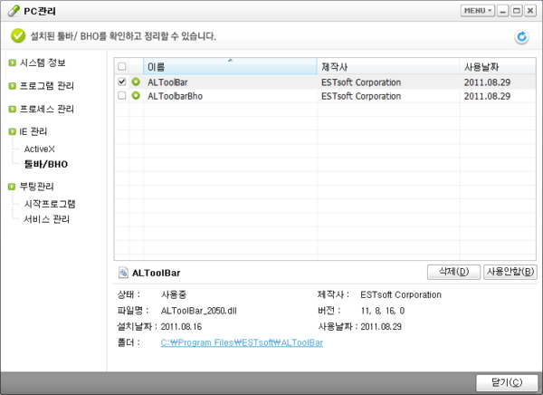 - 툴바 및 BHO를 삭제하거나 "사용안함" 설정으로 변경할 수 있습니다.