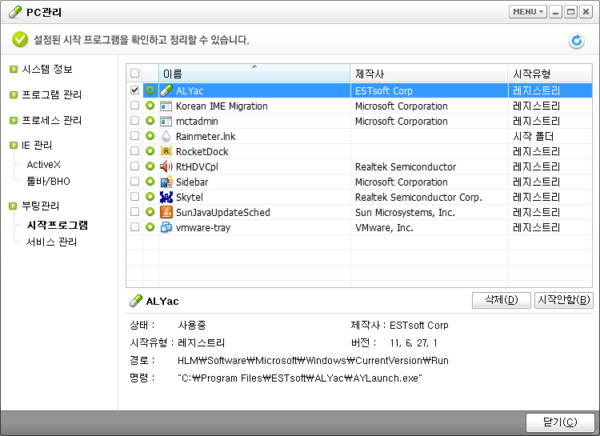 - [삭제] 버튼을 누르면 자동실행 레지스트리에 등록된 시작 프로그램을 삭제합니다.