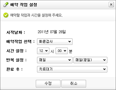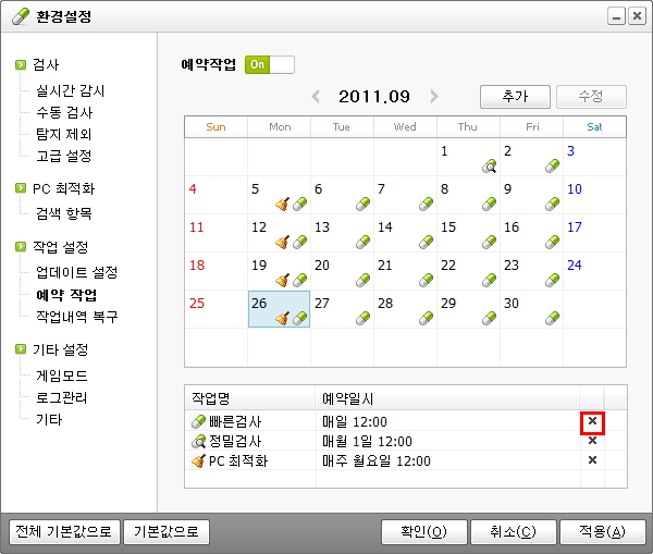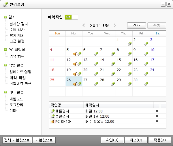 예약 작업(정밀검사, 빠른검사, PC최적화, 업데이트)을 선택한 후 예약 작업을 실행할 시간, 반복 설정(매일, 매주, 매월, 없음), 완료 후 작업 내용 (치료대기, 자동치료, 자동치료 후 창닫기, 자동치료 후 시스템 종료)을 선택합니다."예약 작업을 추가했을 때 [확인]이나 [적용] 버튼을 클릭해야만 새로운 설정이 적용됩니다."