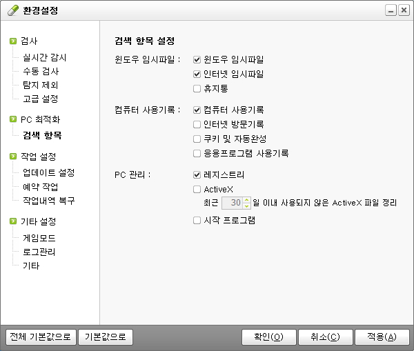 - ActiveX 정리 : 기본 설정으로 30일 이상 사용되지 않은 ActiveX 파일을 정리합니다.