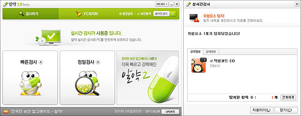 - 바이러스나 악성코드가 포함된 파일이 다운로드 되거나 실행될 경우 팝업창이 뜨고 바이러스와 악성코드의 위협을 사용자에게 안내하고 치료/삭제하도록 도와줍니다.