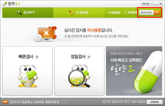 )을 클릭하거나 알약의 트레이 아이콘에서 실시간 감시를 비활성화할 수 있습니다.