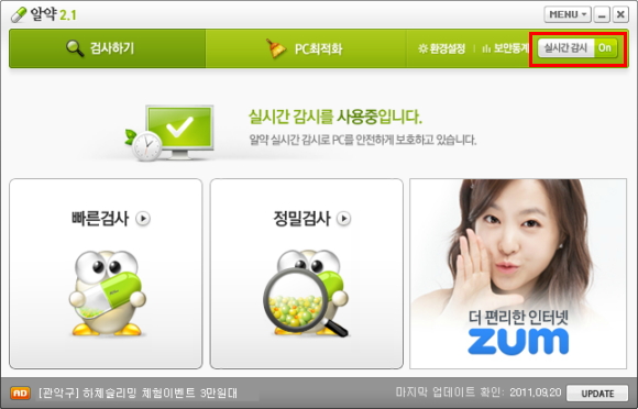 사용자의 PC를 실시간으로 감시하여 바이러스 및 악성코드 등에 노출되는 위험을 사전에 차단/처리합니다.