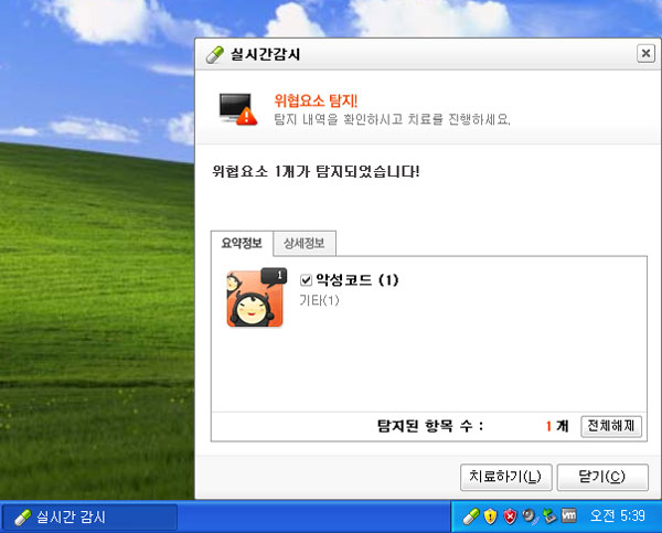 - [닫기] 버튼을 클릭하면 악성코드를 치료하지 않고 실시간 감시 창을 닫습니다.