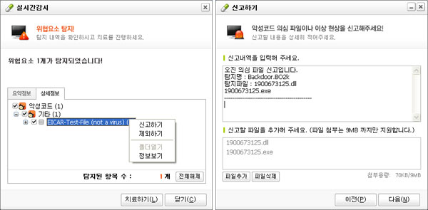 - - 실시간 감시에서 탐지된 악성코드를 이스트소프트 긴급대응센터와 분석센터로 신고하실 수 있습니다.