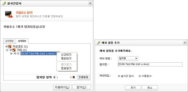 - - 실시간 감시에서 탐지된 악성코드에 대한 정보를 확인할 수 있습니다.