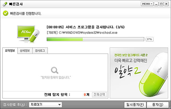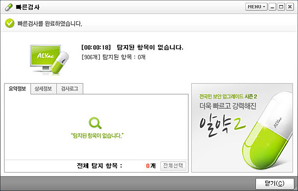 - 악성코드가 발견되지 않는 경우에는 "탐지된 항목이 없습니다." 라고 표시됩니다.