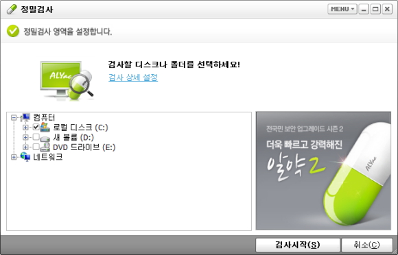 - 사용자 PC의 모든 하드디스크 또는 지정한 폴더를 대상으로 상세한 검사를 수행합니다.