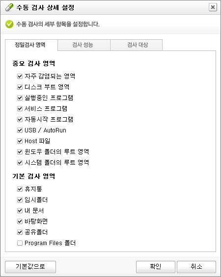 - 빠른 검사에서 검사 대상 영역(중요 영역과 사용자 지정 영역)을 설정할 경우에는 [환경설정]의 수동검사 상세 설정을 이용합니다. -> 환경설정의 수동검사 바로가기