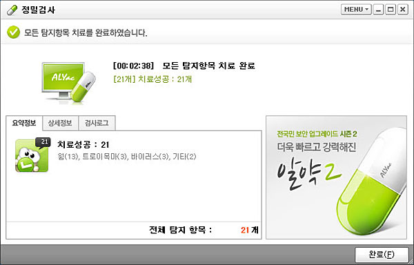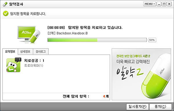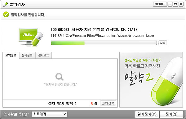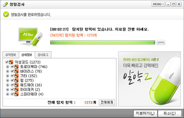 알약의 검사가 모두 완료된 후 악성코드가 발견되었다면 치료를 해야 합니다.