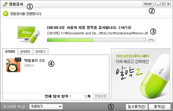 - 활동하지 않고 숨어 있는 악성코드에 대해서도 검사가 가능하기 때문에 일주일에 한번 정도는 정밀 검사를 실행하는 것이 좋습니다.
