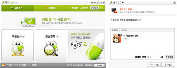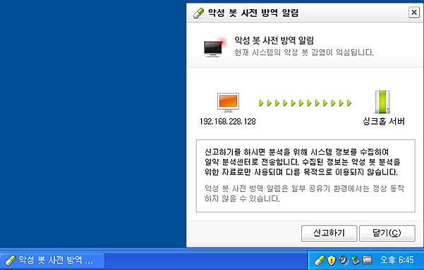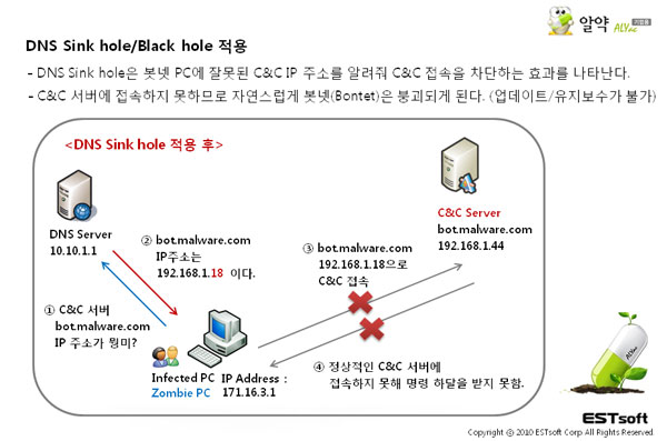 좀비 PC들의 네트워크인 봇넷(Botnet)을 무력화시킬 수 있는 DNS 싱크홀(Sinkhole) 기반의 악성봇 사전방역 기능이 알약에 추가되어 사용자 PC의 악성봇 감염여부를 확인했거나 또는 악성봇 감염이 의심되는 경우 바로 사용자에게 알려드립니다.