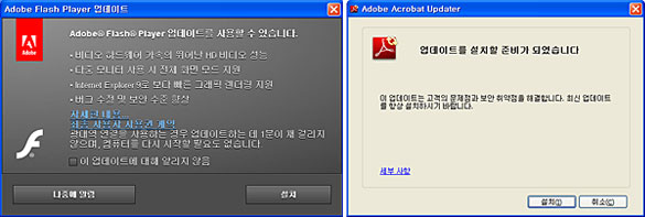 - 최근 악성코드가 PC에 침투하기 위해 Adobe사의 Flash와 Acrobat 제품의 보안 취약점도 많이 이용되고 있으므로 보안 패치를 함께 설치해야 합니다.